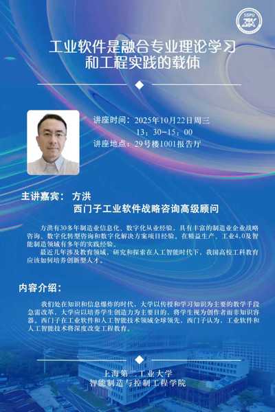 为深化产教融合,创新人才培养模式,我们于2025年10月22日在29号楼10楼报告厅举行了 “产教融合・智创未来” 企业专家系列讲座的首场活动。本次活动特邀西门子工业软件(上海)有限公司战略咨询高级顾问方洪,为智控学院全体教师带来了一场题为“工业软件是融合专业理论学习和工程实践的载体”的深度报告。